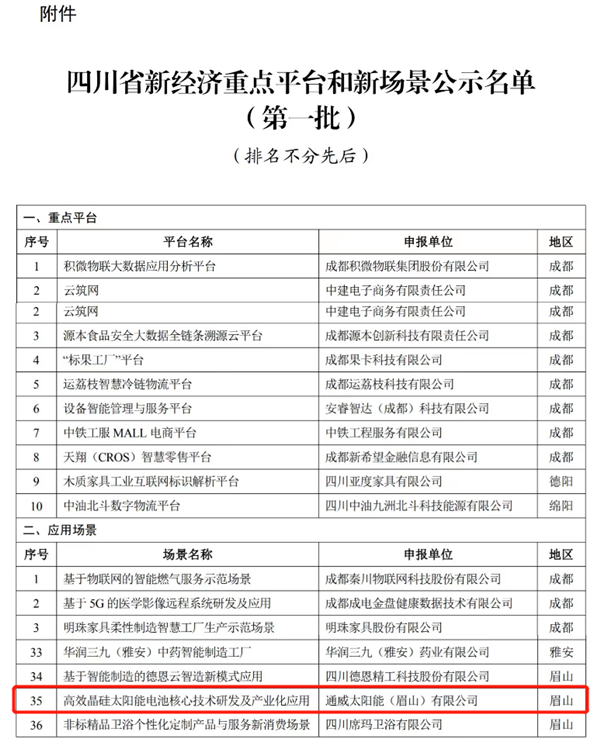 2月6日,四川省經濟和信息化廳在官網公示完成《關于四川省新經濟重點平臺和新場景名單(第一批)》,通威太陽能眉山基地“高效晶硅太陽能電池核心技術研發及產業化應用”作為眉山3個入列場景之一成功入列首批新場景公示名單。