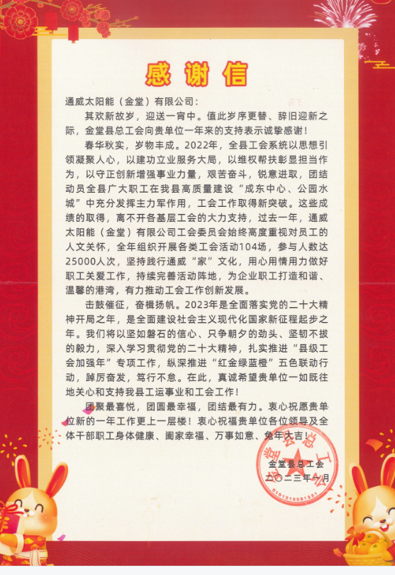 近日,通威太陽(yáng)能金堂基地收到來自金堂縣總工會(huì)發(fā)來的感謝信,對(duì)通威太陽(yáng)能金堂基地2022年工會(huì)工作及取得的成果表示高度肯定。
