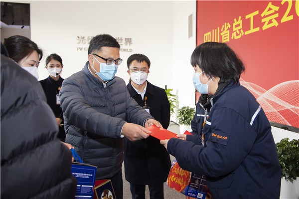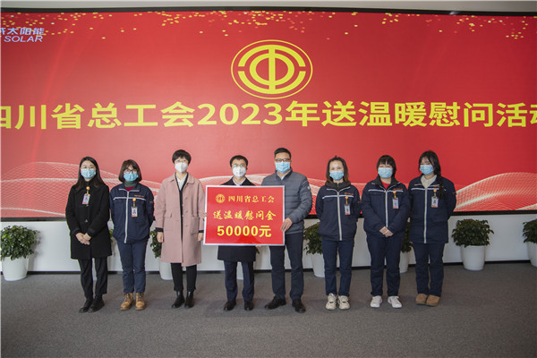 溫暖相伴,與愛同行。彭闖副主席現場慰問了通威太陽能眉山基地職工代表及2名省級困難職工,作為“娘家人”送上關愛禮包及慰問金,并表示通威太陽能在工作環境、晉升渠道、福利保障等方面都為員工提供優質的平臺,鼓勵困難職工踏實工作,保持樂觀心態,積極面對困難。同時,發放給通威太陽能眉山基地送溫暖慰問金5萬元。