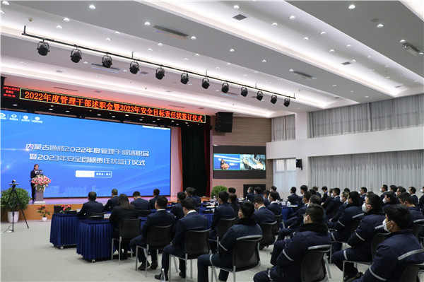 述職會上,參與述職的領導干部圍繞2022年“高效經營,執行到位”經營管理思路和三大主題、十大提案引領下的重點工作、重要舉措、亮點提升進行匯報,并對2023年工作目標、推進思路進行匯報。會上,總經辦領導與各分管部門簽訂2023年安全目標責任狀。