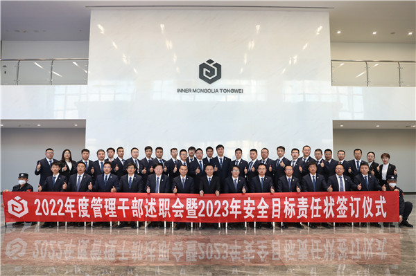 12月30日,內蒙古通威2022年度管理干部述職會暨2023年安全目標責任狀簽訂儀式成功舉行,通威股份副總裁、永祥股份總經理李斌,永祥股份副總經理易繼成視頻出席,永祥股份副總經理、內蒙古通威總經理袁中華參加。
