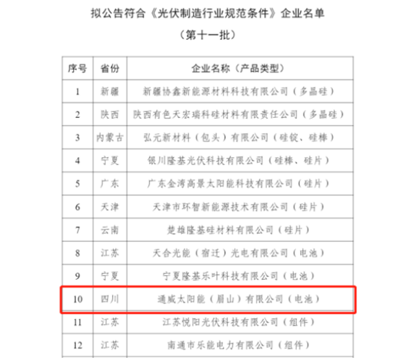 12月22日,國家工業(yè)和信息化部網(wǎng)站對擬公告符合《光伏制造行業(yè)規(guī)范條件》企業(yè)名單(第十一批)完成公示,此次全國共遴選22家企業(yè)入圍名單,通威太陽能眉山基地作為四川省唯一入列企業(yè),成功入選“光伏制造業(yè)規(guī)范條件”企業(yè)公示名單。