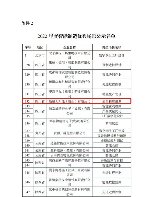 近日,國家工業(yè)和信息化部網(wǎng)站公示了關(guān)于2022年度智能制造示范工廠揭榜單位和優(yōu)秀場景名單,通威太陽能眉山基地入列名單并順利完成公示。