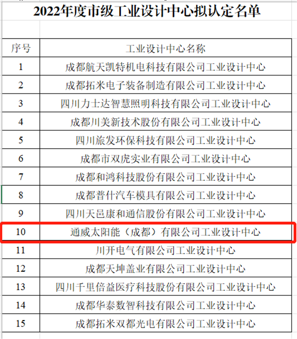 近日,由成都市經(jīng)濟(jì)和信息化局組織開展的2022年成都市認(rèn)定工業(yè)設(shè)計(jì)中心工作順利結(jié)束,并公布了“2022年成都市市級(jí)工業(yè)設(shè)計(jì)中心名單”,通威太陽(yáng)能雙流基地榮列其中,這是公司首次獲得“工業(yè)設(shè)計(jì)中心”方面的權(quán)威認(rèn)證。