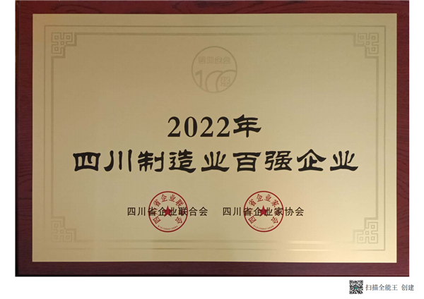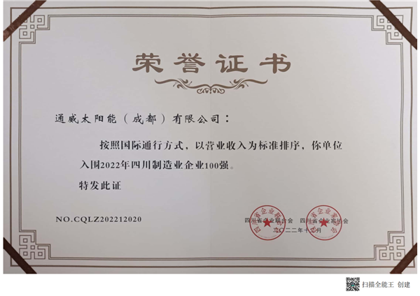 通威太陽能“2022年四川制造業(yè)百強企業(yè)”證書