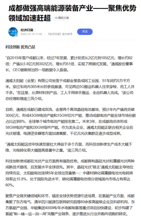 12月10日,《經(jīng)濟(jì)日?qǐng)?bào)》以“成都做強(qiáng)高端能源裝備產(chǎn)業(yè)——聚焦優(yōu)勢(shì)領(lǐng)域加速趕超”為題,聚焦報(bào)道通威太陽(yáng)能金堂基地在科技創(chuàng)新方面的亮眼表現(xiàn)。