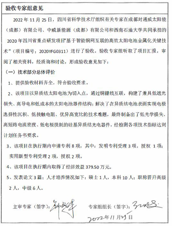 11月25日,四川省科學技術廳組織專家組對通威太陽能雙流基地承擔的“四川省重點研發項目”進行驗收并順利通過。