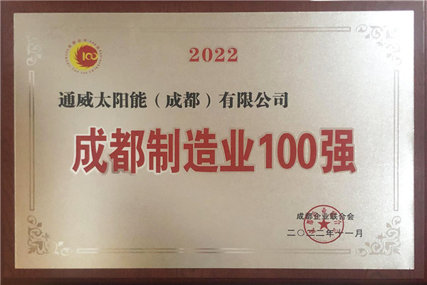 通威太陽能獲“2022成都制造業百強企業”獎牌