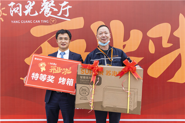 為回饋新老員工,開業活動還精選準備了幸運大抽獎活動,電烤箱、大米、食用油、餐券、水果等獎品琳瑯滿目,吸引了各部門員工紛紛駐足參與。抽獎現場,姚總為獲得大獎的幸運兒頒發獎品。
