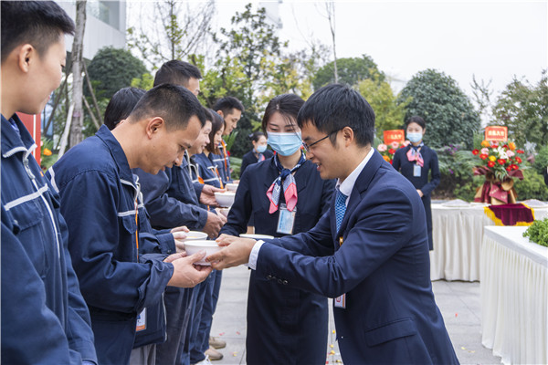 活動伊始,通威太陽能眉山基地總經理助理姚騫攜各廠部負責人完成切蛋糕儀式,祝福眉山基地陽光餐廳開業大吉。同時,本次活動還為11月8日及11月18日生日的員工帶來了小驚喜。姚總親自為員工送上生日愛心面,送上溫暖的生日祝福,讓大家真切感受到公司的人文關懷。
