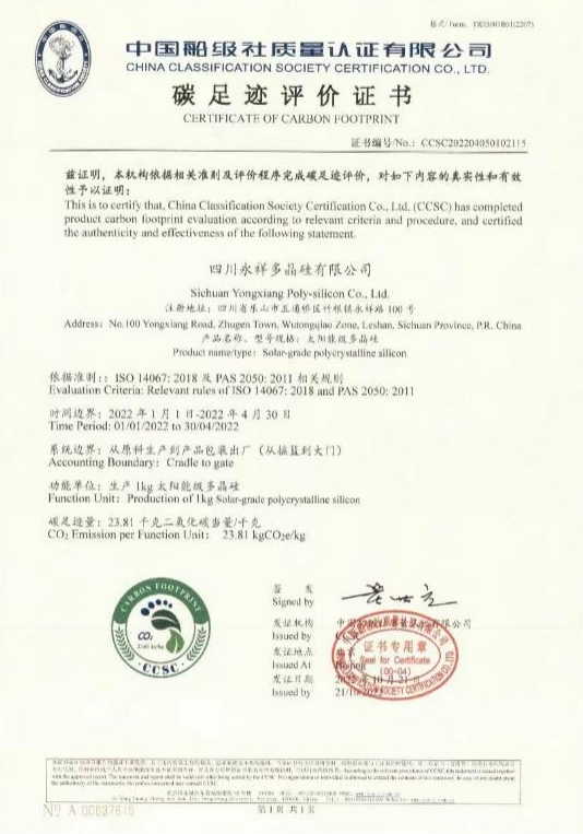 四川永祥多晶硅有限公司碳足跡評價證書