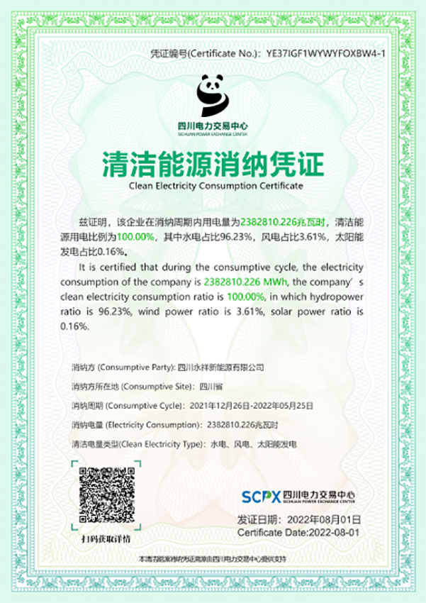 把碳足跡核算清楚,是企業掌握自身碳排放家底、推動綠色低碳循環發展的首要前提。永祥生產高純晶硅,制造階段的能源消耗主要為外購電力,永祥始終堅持綠色發展,積極采購可再生能源電力,2022年上半年,在四川省主管部門、四川電力交易中心支持下,獲得了四川電力交易中心經省級政府部門授權出具的、有公信力的全省首張清潔能源消納憑證。該憑證以電力市場化交易合同數據和結算數據為依據,精確溯源了企業使用電量來源、類型及占比,憑證表明永祥清潔能源用電比例為100%。