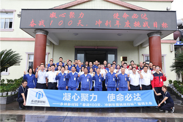 凝心聚力、使命必達,為激發全體永祥新材料人的拼搏精神,增強沖刺年度挑戰目標的決心,9月24日,永祥新材料成功召開2022年“奮戰100天,沖刺年度挑戰目標”誓師大會,公司常務副總經理廖萬能、副總工程師吳銘生、總經理助理李文彬、各部門助理工程師及以上人員、后勤職能部門全員參會。會議由人事行政部副經理先鴻敏主持。