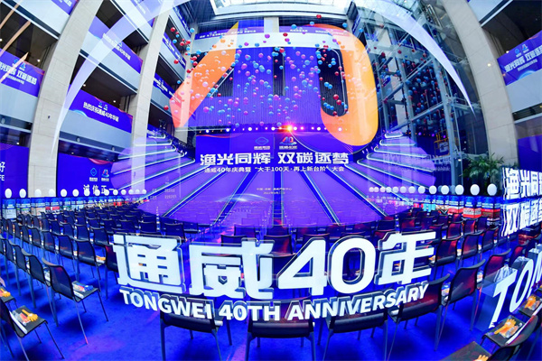 近日,“漁光同輝 雙碳逐夢(mèng)”通威40年慶典暨“大干100天·再上新臺(tái)階”大會(huì)在通威國(guó)際中心隆重舉行。在嚴(yán)格遵守疫情防控規(guī)定的情況下,大會(huì)通過線上線下結(jié)合的方式,海內(nèi)外5萬(wàn)通威人相聚“云端”,共慶通威40年華誕。中央電視臺(tái)著名主持人周濤、劉棟棟主持大會(huì)。韓磊、呂薇、徐濤、降央卓瑪、李丹陽(yáng)、騰格爾、戴玉強(qiáng)等著名歌唱家、藝術(shù)家傾情演出,激情唱響通威40年。櫛風(fēng)沐雨四十載,春華秋實(shí)滿庭芳。5萬(wàn)通威人帶著累累碩果邁上新征程,一路征程一路歌,向著更高質(zhì)量、更高水平發(fā)展奮進(jìn),踏出高質(zhì)量發(fā)展的鏗鏘足音。