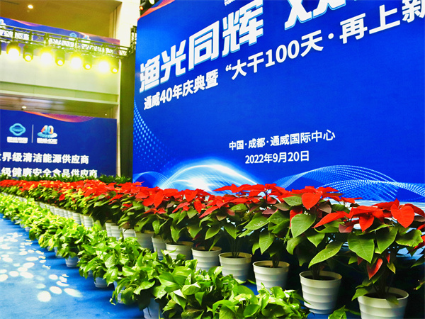 期間,隨處可見的通威40年主題元素裝置、展現(xiàn)通威發(fā)展的時(shí)光隧道、一盆盆鮮艷多姿的景觀花卉,將大會(huì)現(xiàn)場(chǎng)裝扮一新。通威藍(lán)與喜慶紅,交相輝映,現(xiàn)場(chǎng)處處洋溢著喜慶氛圍,熱情迎接各位領(lǐng)導(dǎo)嘉賓,共慶通威40年華誕。