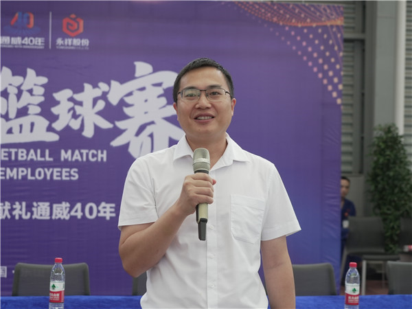 為慶祝通威成立40年,豐富廣大職工業余文化生活,增強團隊凝聚力,展現拼搏向上的永祥精神,9月21日,永祥股份“獻禮通威40年”職工籃球賽在永祥新能源籃球館拉開帷幕,永祥股份副總經理兼永祥新能源常務副總經理羅周出席開幕式并宣布籃球賽開幕。