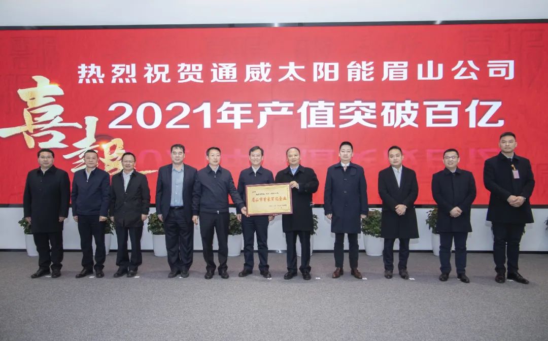 2021年,通威太陽能(眉山)有限公司實現產值101億元,成為眉山市第一家百億企業。今年1月25日,在通威太陽能眉山基地展廳,眉山市委書記胡元坤向劉漢元主席頒發“眉山市首家百億企業”獎牌。