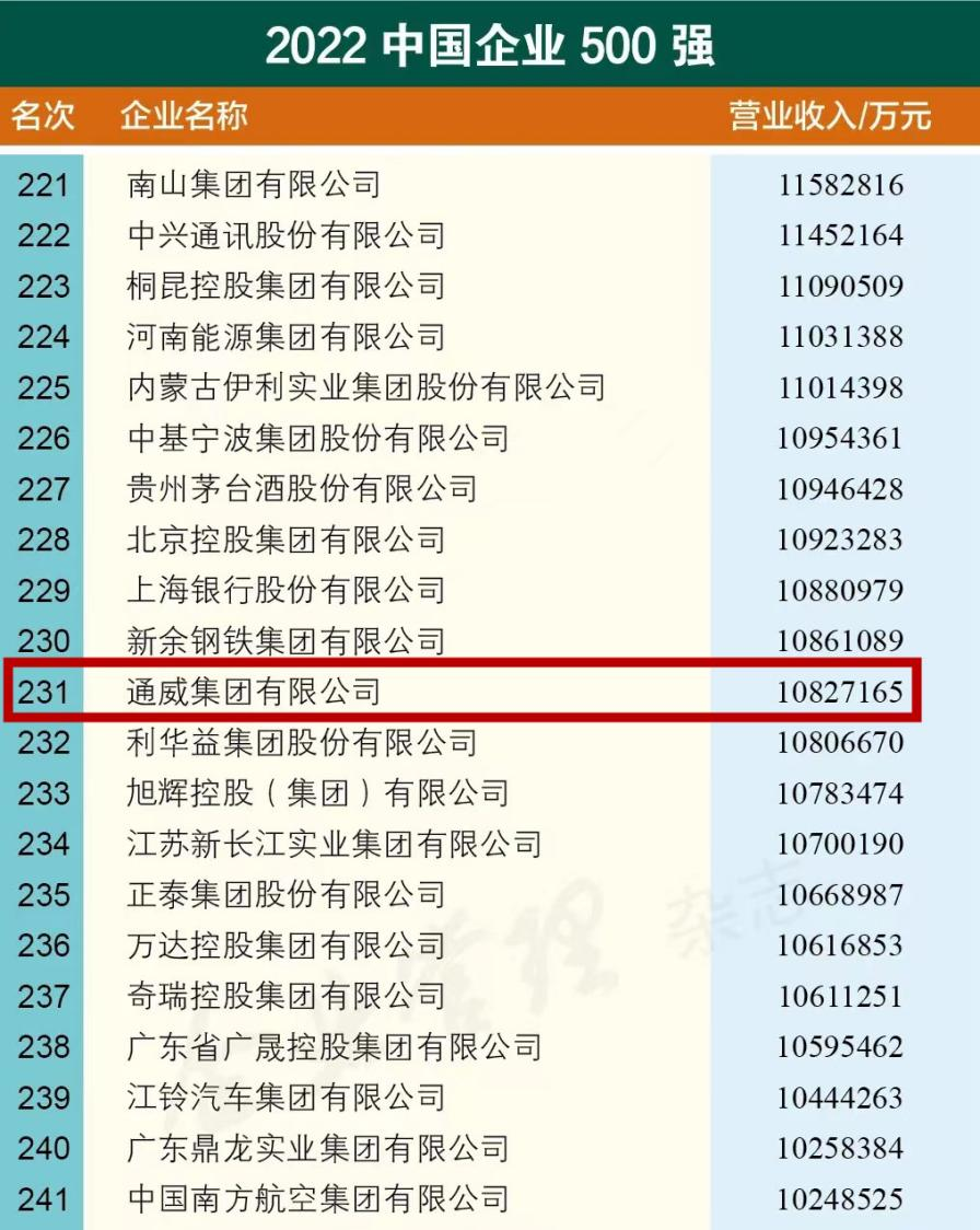 9月6日上午,中國(guó)企業(yè)聯(lián)合會(huì)、中國(guó)企業(yè)家協(xié)會(huì)發(fā)布了2022中國(guó)企業(yè)500強(qiáng)、中國(guó)制造業(yè)企業(yè)500強(qiáng)、中國(guó)服務(wù)業(yè)企業(yè)500強(qiáng)榜單。作為深耕綠色農(nóng)業(yè)、綠色能源的大型跨國(guó)集團(tuán)公司,通威以超1082億元營(yíng)收,榮登“中國(guó)500強(qiáng)企業(yè)”第231位、“中國(guó)制造業(yè)企業(yè)500強(qiáng)”第107位,充分展現(xiàn)了在復(fù)雜多變的經(jīng)濟(jì)形勢(shì)下持續(xù)穩(wěn)健的發(fā)展態(tài)勢(shì)和卓越的競(jìng)爭(zhēng)實(shí)力。