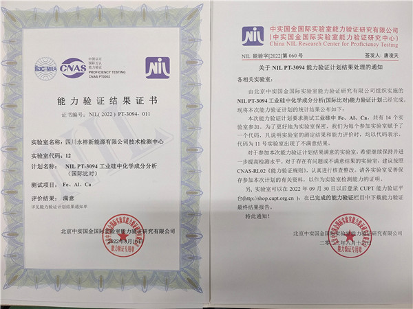 本次能力驗證計劃從今年4月開始擬定,歷經4個月,利用實驗室間比對的方法對實驗室測量能力的衡量。公司長期嚴格按照國家標準操作,嚴謹務實出具檢測數據,工業硅粉測試能力得到第三方專業認可機構的肯定與認可,終榮獲工業硅粉能力驗證證書。