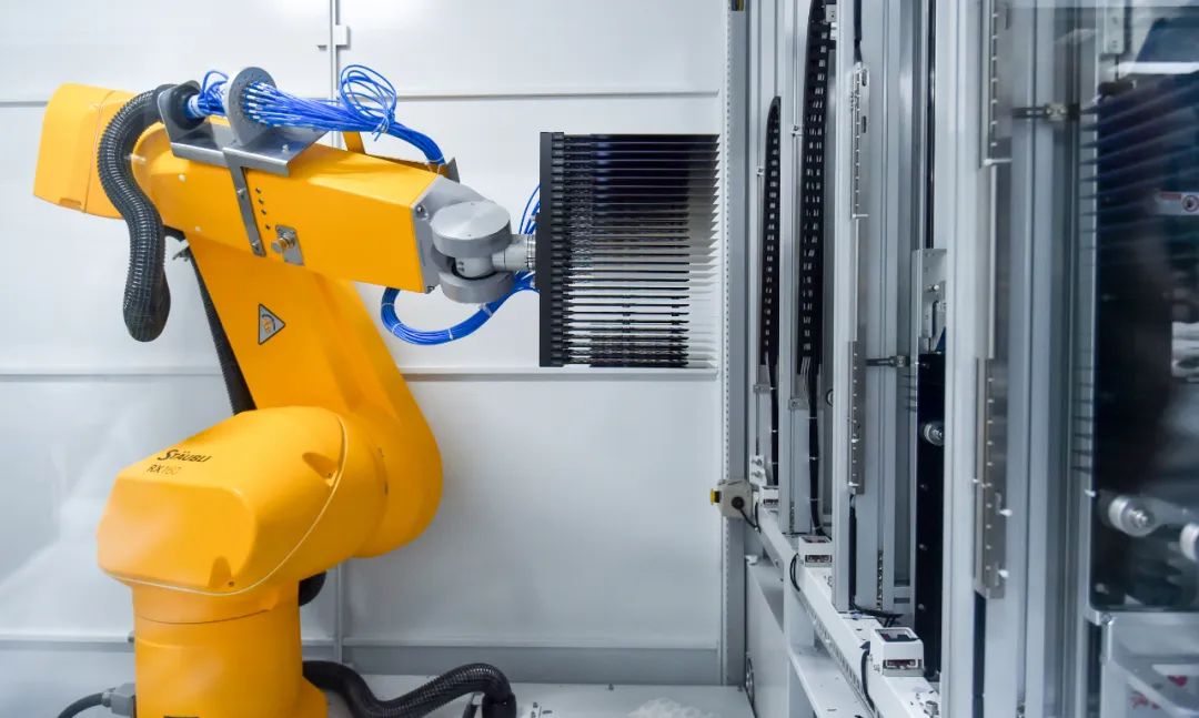 ▲通威太陽能智能制造生產線上,機械臂快速轉運電池片