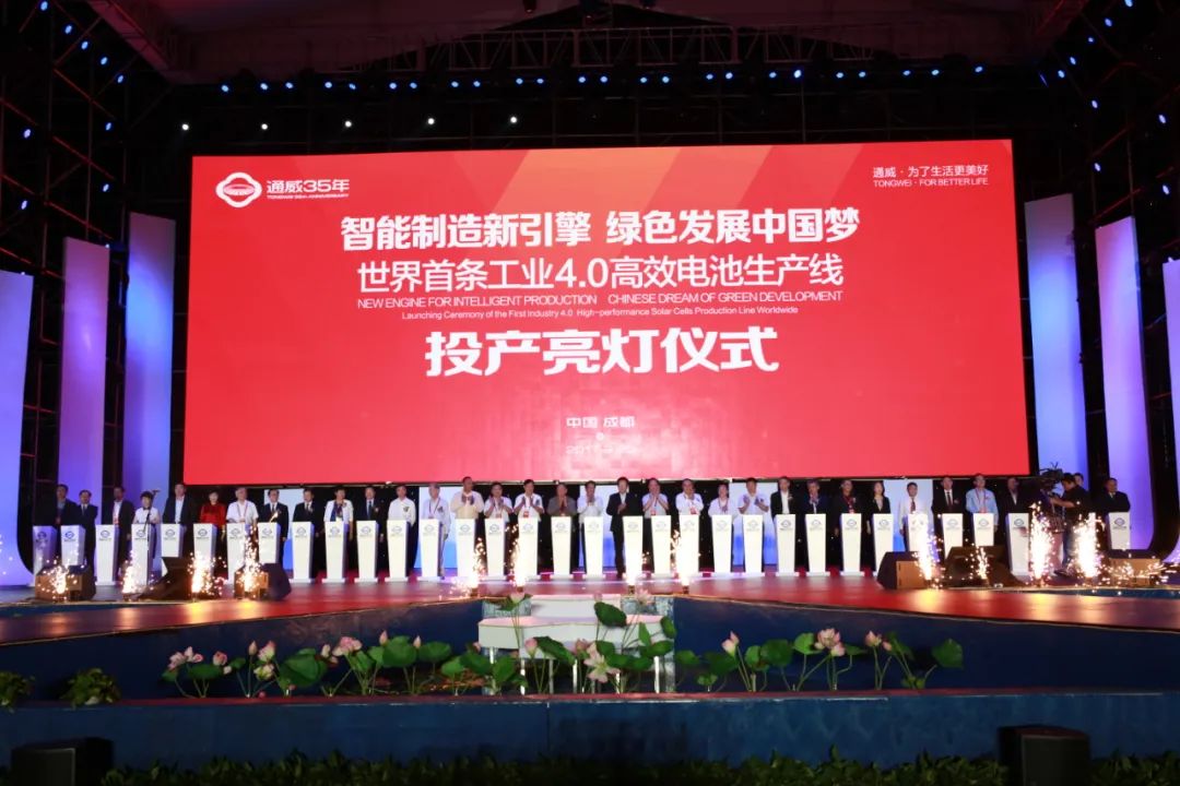 2017年9月20日,在通威太陽能雙流基地,劉漢元主席與嘉賓一道,共同啟動了通威太陽能世界首條工業4.0高效電池生產線投產亮燈儀式。該產線正式投產,開啟了通威“智能制造新引擎,綠色發展中國夢”全新征程,為全行業樹立了中國智能制造的典范,更彰顯了通威以“智能制造”“綠色發展”推動人類能源革命的堅定決心。