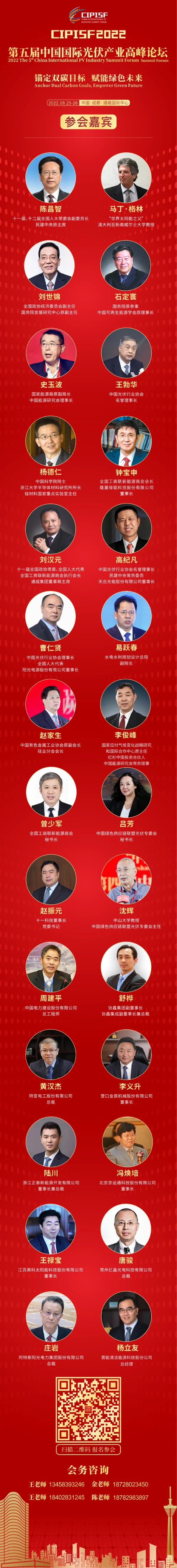 此外,十一科技董事長、黨委書記趙振元,中國電力建設股份有限公司總工程師周建平,協鑫集團副董事長、協鑫集成副董事長兼總裁舒樺,特變電工股份有限公司總裁黃漢杰,營口金辰機械股份有限公司董事長李義升,浙江正泰新能源開發有限公司董事長兼總裁陸川,北京京運通科技股份有限公司董事長馮煥培,江蘇美科太陽能科技股份有限公司董事長王祿寶,晶澳太陽能科技股份有限公司輪值總裁楊愛青,常州億晶光電科技有限公司總裁唐駿,阿特斯陽光電力集團股份有限公司總裁莊巖,晉能清潔能源科技股份公司總經理楊立友,福建安泰新能源科技有限公司總裁黃麗琴,蘇州騰暉光伏技術有限公司總裁董曙光,江西展宇光伏科技有限公司總經理宋鈺等也將一并出席。