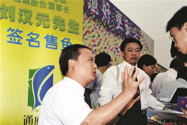 這是2002年9月18日,中國首批有品牌的無公害魚——“通威魚”上市當(dāng)天,鏡頭記錄下的劉漢元主席簽名售魚瞬間。