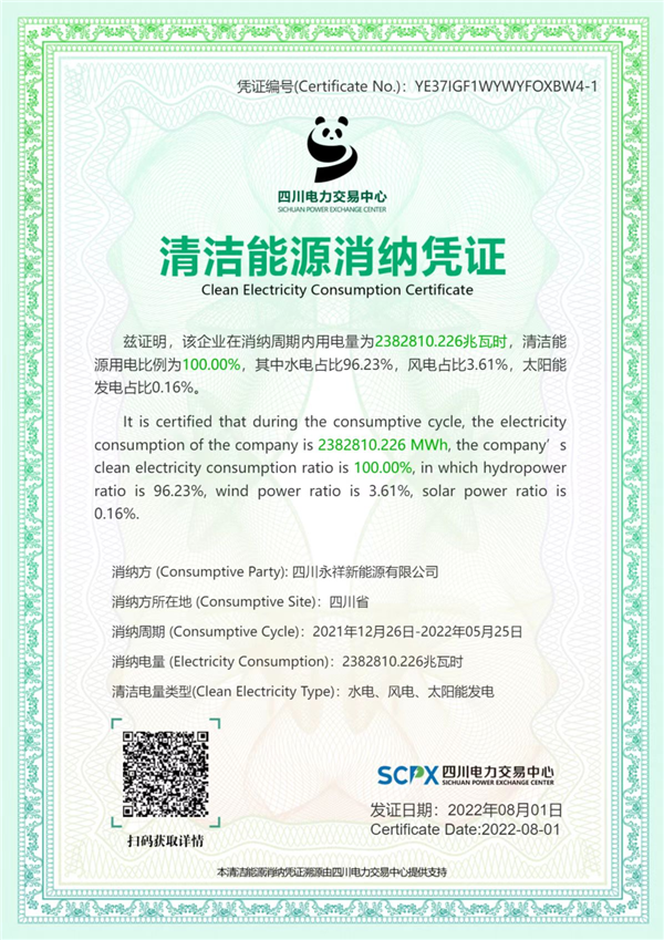 憑證用中英文說明:永祥新能源在2021年12月26日至2022年5月25日的消納周期內,用電量為2382810.226兆瓦時,清潔能源用電比例為100.00%,其中水電占比96.23%,風電占比3.61%,太陽能發電占比0.16%。