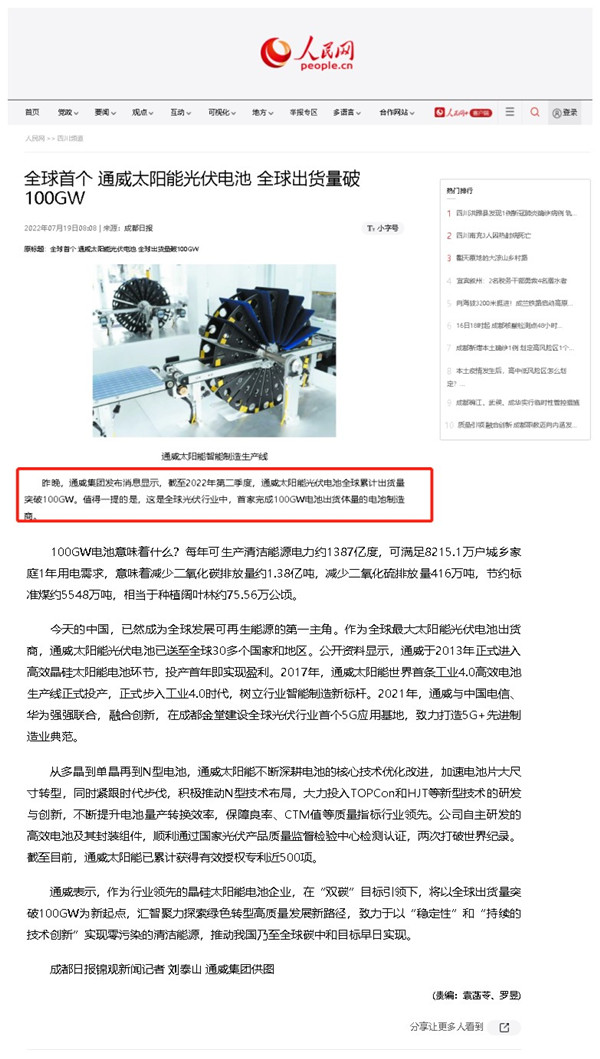 人民網聚焦通威太陽能光伏電池全球出貨量突破100GW