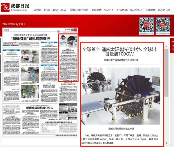 成都日報聚焦通威太陽能光伏電池全球出貨量突破100GW