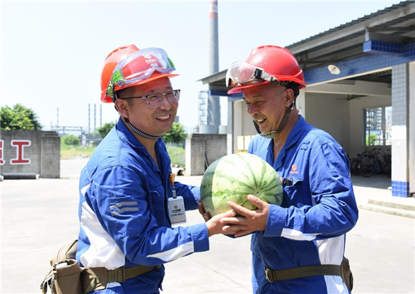 上午11點,室外地面溫度已經近40℃。永祥樹脂公司執行總經理杜亦軍深入生產現場,為高溫下默默堅守一線的奮斗者送去冰鎮的飲料和西瓜等防暑降溫品,讓員工感受到公司的關懷和夏日的清涼。在高溫下,杜亦軍一行先后前往中控樓、機修車間、聚合包裝、乙炔車間,為員工送上清涼飲品,并代表通威股份副總裁、永祥股份總經理李斌向大家戰高溫、斗酷暑的辛勤付出表示感謝,叮囑大家在加強安全管理,做好安全生產的同時,使用好防暑降溫清涼飲品,保重身體。