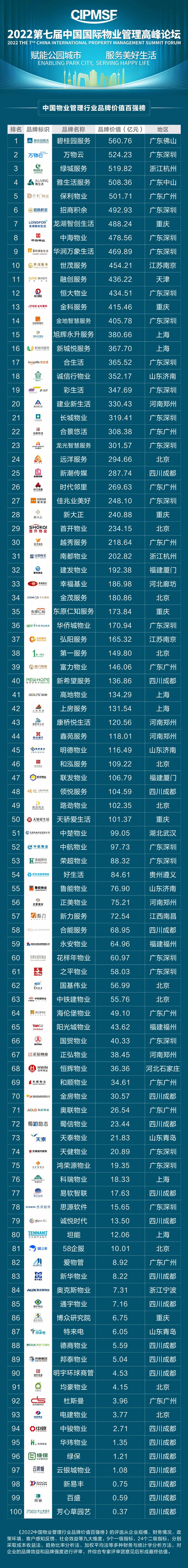 7月1日,以“賦能公園城市 服務美好生活”為主題的2022第七屆中國國際物業管理高峰論壇將在成都通威國際中心盛大啟幕。在物業管理行業主管部門領導、行業頂級專家、領軍企業家、研究咨詢機構以及企業精英等的共同見證下,“2022中國物業管理行業品牌價值百強榜”重磅首發。