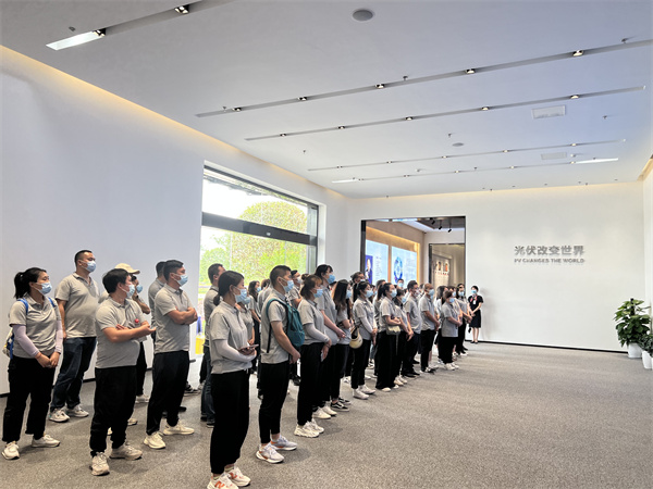 活動中,通威食品“文化尋根團”還走進通威太陽能眉山基地,在一項項實時數(shù)據(jù)和廠區(qū)微觀全景沙盤的展示下,全面了解通威雙綠色產(chǎn)業(yè)鏈布局、發(fā)展成就,以及通威太陽能在自動化生產(chǎn)、綠色發(fā)展等方面作出的重要貢獻。走進無人制造車間,一支支特殊的機械臂有序揮舞,一輛輛無人駕駛的IGV小車往來穿梭,全封閉的智能制造高效太陽能電池片自動化生產(chǎn)線高速運轉(zhuǎn),充分展現(xiàn)了通威智能智造的領(lǐng)先實力,大家的自豪感油然而生。