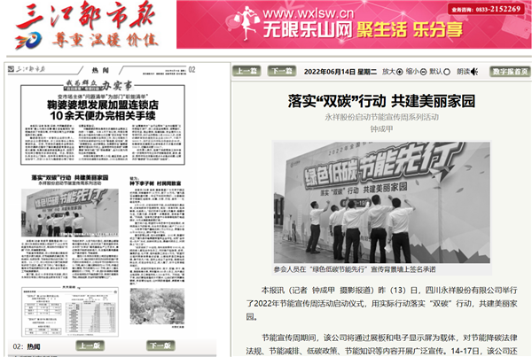 6月14日,樂山日?qǐng)?bào)、三江都市報(bào)以“落實(shí)雙碳行動(dòng) 共建美麗家園”為題,聚焦永祥股份啟動(dòng)節(jié)能宣傳周系列活動(dòng)。
