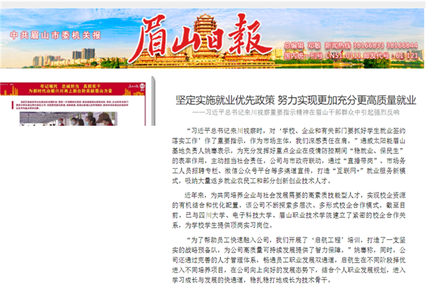 6月15日,眉山網、眉山日報發表題為《堅定實施就業優先政策 努力實現更加充分更高質量就業》的報道,聚焦通威太陽能眉山基地助力勞動者高質量就業。