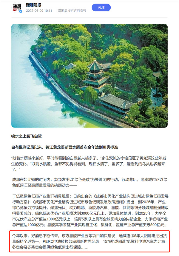 6月9日,瀟湘晨報、錦觀新聞先后以“綠色低碳發(fā)展,匯聚高質(zhì)量發(fā)展動力”為題,聚焦通威太陽能助力綠色低碳產(chǎn)業(yè)發(fā)展。