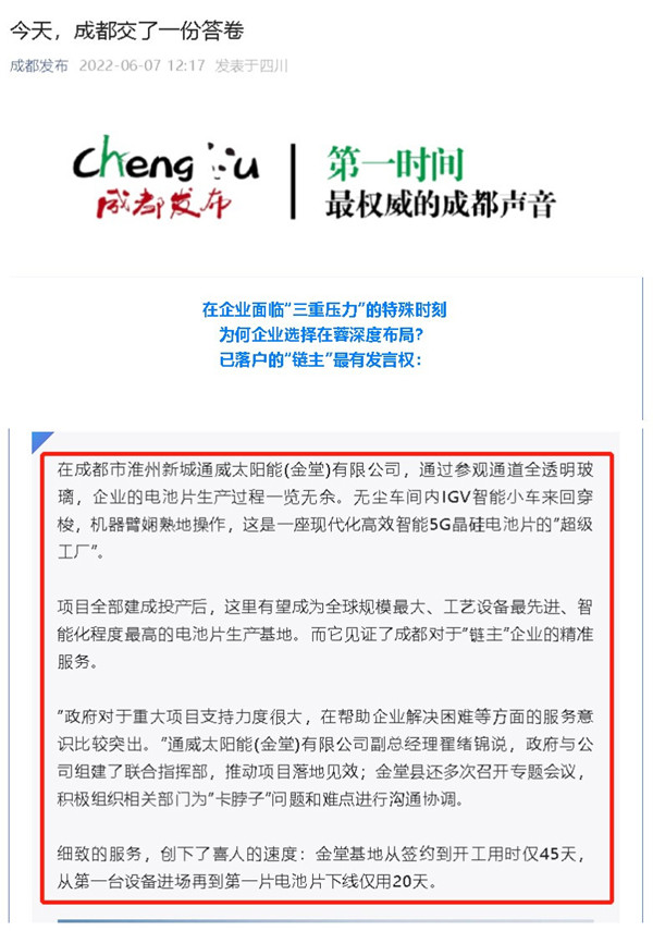 成都發(fā)布在題為“今天,成都交了一份答卷”的報(bào)道中指出,在成都市淮州新城通威太陽(yáng)能(金堂)有限公司,通過(guò)參觀通道全透明玻璃,企業(yè)的電池片生產(chǎn)過(guò)程一覽無(wú)余。無(wú)塵車間內(nèi)IGV智能小車來(lái)回穿梭,機(jī)器臂嫻熟地操作,這是一座現(xiàn)代化高效智能5G晶硅電池片的“超級(jí)工廠”。項(xiàng)目全部建成投產(chǎn)后,這里有望成為全球規(guī)模最大、工藝設(shè)備最先進(jìn)、智能化程度最高的電池片生產(chǎn)基地……金堂基地從簽約到開(kāi)工用時(shí)僅45天,從第一臺(tái)設(shè)備進(jìn)場(chǎng)再到第一片電池片下線僅用20天。報(bào)道對(duì)通威太陽(yáng)能項(xiàng)目迅速開(kāi)建,促進(jìn)地區(qū)產(chǎn)業(yè)建圈強(qiáng)鏈,加快推進(jìn)現(xiàn)代產(chǎn)業(yè)體系高質(zhì)量發(fā)展步伐表示肯定。