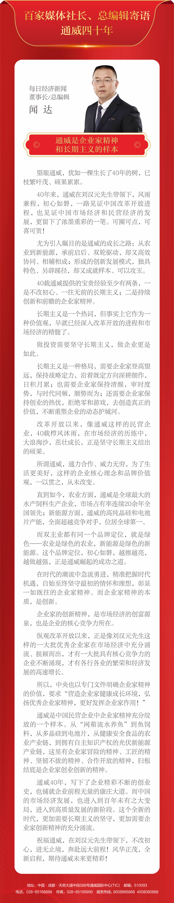 百家媒體社長、總編輯寄語通威四十年<br>通威是企業(yè)家精神和長期主義的樣本