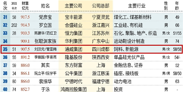 5月12日,全球知名權(quán)威商業(yè)雜志《福布斯》發(fā)布了2022年全球企業(yè)2000強(qiáng)榜單,憑借高質(zhì)量穩(wěn)健發(fā)展和持續(xù)向好的業(yè)績(jī),通威股份榮耀上榜。次日,2022新財(cái)富500富人榜隆重揭曉,十一屆全國(guó)政協(xié)常委、全國(guó)人大代表、通威集團(tuán)董事局劉漢元主席,通威集團(tuán)管亞梅董事長(zhǎng)榮列榜單第35位,較去年上升16位。