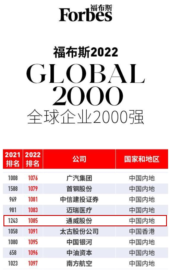 通威股份榮登《福布斯》2022年全球企業(yè)2000強(qiáng)榜單