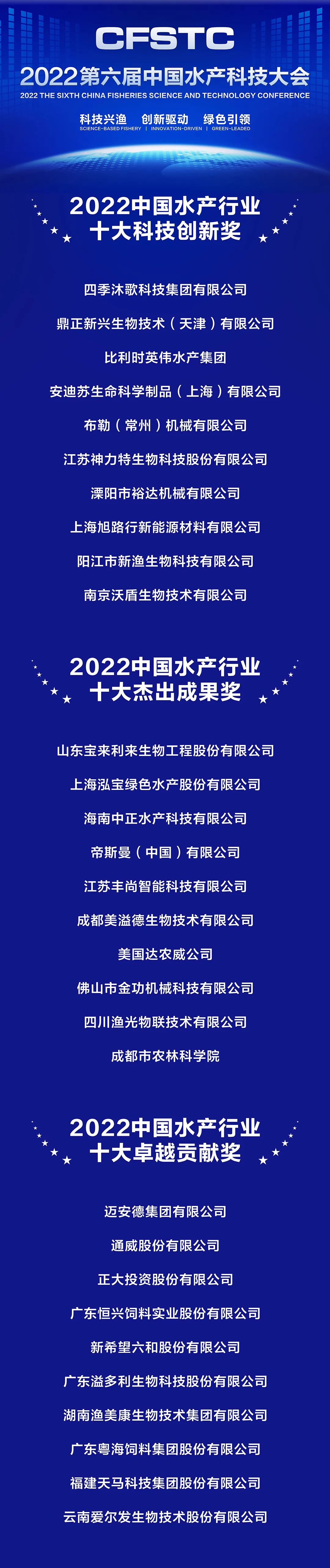 當(dāng)天,大會(huì)還頒發(fā)了2022中國水產(chǎn)行業(yè)“十大科技創(chuàng)新獎(jiǎng)”“十大杰出成果獎(jiǎng)”“十大卓越貢獻(xiàn)獎(jiǎng)”,向推動(dòng)我國水產(chǎn)行業(yè)科技進(jìn)步和高質(zhì)量發(fā)展作出卓越貢獻(xiàn)的企業(yè)致敬。