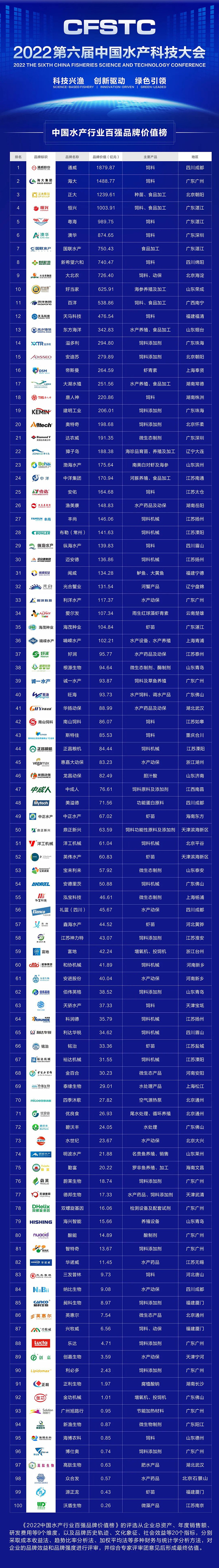 4月22日,以“科技興漁 創(chuàng)新驅(qū)動(dòng) 綠色引領(lǐng)”為主題的2022第六屆中國水產(chǎn)科技大會(huì)在成都通威國際中心隆重舉行。來自中央、省、市政府部門及行業(yè)協(xié)會(huì)重要領(lǐng)導(dǎo)、行業(yè)專家、領(lǐng)袖企業(yè)家以及企業(yè)精英,以線上線下的方式共同出席。作為本屆大會(huì)的“重頭戲”,“2022中國水產(chǎn)行業(yè)百強(qiáng)品牌價(jià)值榜”隆重揭曉,通威、海大、正大、恒興、邁安德、溢多利、愛爾發(fā)、四季沐歌等100個(gè)水產(chǎn)行業(yè)品牌榮列榜單。(完整榜單請(qǐng)?jiān)斠娢哪?/p>