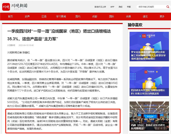4月19日,人民資訊、川觀新聞、四川在線等媒體聚焦通威太陽能金堂基地產(chǎn)品出口量,獲贊外貿(mào)出口“主力軍”。