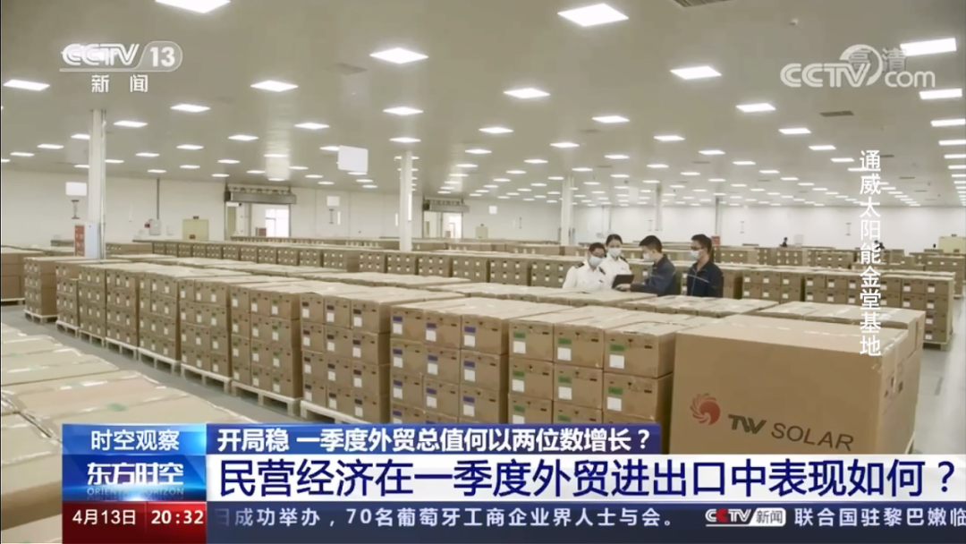 4月13日,央視《新聞聯播》播出“一季度我國外貿開局平穩”報道,央視記者赴通威太陽能金堂基地現場采訪,實地了解企業外貿出口情況。同日,央視《東方時空》在報道“我國民營經濟一季度發展情況”時,也聚焦了通威太陽能。截至目前為止,今年央視已經4次聚焦通威新能源產業發展成果和創新實力,展示了通威為代表的中國光伏企業強勁的發展實力。