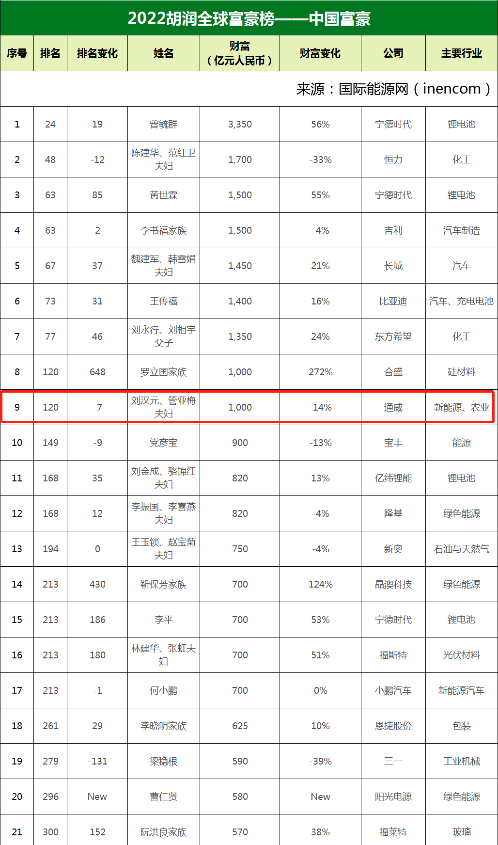 3月17日,胡潤研究院發布《2022胡潤全球富豪榜》。這是胡潤研究院連續第十一年發布“全球富豪榜”。今年共有來自69個國家2558家公司的3381位十億美金企業家上榜。其中,全國人大代表、全國工商聯副主席、通威集團董事局劉漢元主席,通威集團管亞梅董事長榮列榜單第120位。