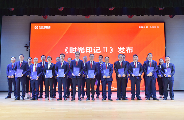 會議同步舉行《時光印記2》發布儀式,李董向在場干部員工代表發放《時光印記2》,并表示,《時光印記2》詳細記錄了一期項目生產經營和二期工程建設的點點滴滴,新能源的建設凝聚著我們的心血與汗水,也傾注著我們的專注與專業,更見證著我們的智慧與技能,寄寓著我們的深情與感動!