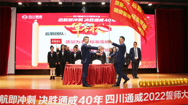 2月28日,四川通威舉行以“啟航即沖刺,決勝通威40年”為主題的2022年誓師大會。通威股份預混料片區總經理劉如芳、華西一區總經理成軍和、華西一區總經理助理兼四川通威總經理彭金鋼、華西片區采購總監曾開建、華西一區財務總監馬立群、品管總監李敏英、四川公司總經理助理兼生產部經理尚兵、四川公司人行經理白麗芬出席會議。四川通威全體干部員工220余人參會。