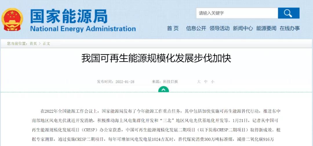 在2022年全國能源工作會議上,國家能源局發布了今年能源工作重點任務,其中包括加快實施可再生能源替代行動,推進東中南部地區風電光伏就近開發消納,積極推動海上風電集群化開發和“三北”地區風電光伏基地化開發等。1月21日,記者從中國可再生能源規模化發展項目(CRESP)辦公室獲悉,中國可再生能源規?;l展二期項目(以下簡稱CRESP二期項目)取得新成效。根據專家測算,通過實施CRESP二期項目,每年可增加風電發電量1024吉瓦時,替代煤炭消費300萬噸標準煤,減排二氧化碳916萬噸,生態環境效益顯著。