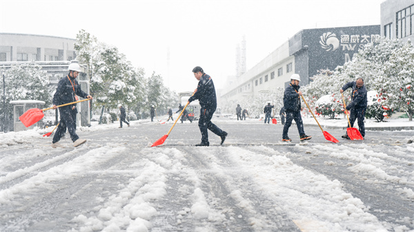 2月6日夜間,合肥降下大雪,且隨著降雪持續(xù),氣溫越來(lái)越低。強(qiáng)降雪天氣造成通威太陽(yáng)能合肥基地廠區(qū)積雪嚴(yán)重,為確保廠區(qū)主次干道道路暢通,重點(diǎn)區(qū)域安全無(wú)隱患,保障車輛、員工安全出行,合肥基地各部門聞雪而動(dòng),積極部署,迅速啟動(dòng)應(yīng)急預(yù)案,全力保障公司生產(chǎn)經(jīng)營(yíng)活動(dòng)正常運(yùn)行。