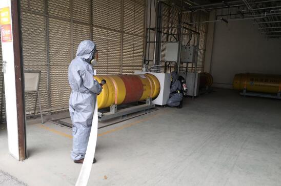 下午15時,參與演練的所有成員提前集合,進行桌面推演,確保演練有序進行。16時,演練正式開始。接到通知后,管制組立即管制現(xiàn)場、清點人數(shù)、組織現(xiàn)場疏散;支援組負責協(xié)調(diào)調(diào)集應急器材及物資保障、做好其他現(xiàn)場救援支援工作、對進入施救的人員進行信息的確認,記錄時間、姓名、人數(shù),并確認PPE穿著妥當、撤出人員后物資清點、傷患救治等其他工作;確認組確認現(xiàn)場泄漏及人員滯留情況,泄漏對其他設備的影響情況;處理組進行設備搶修、處置突發(fā)情況是否有未撤離人員、環(huán)境整理,并防止發(fā)生次生事故、消防處理。